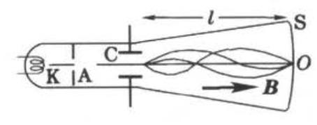 在电容器 $C$ 上加一个不大的横向交变电场,使不同时刻通过这里的电子发生不同程度的偏转.在电容器 $C$ 和荧光屏 $S$ 之间加一均匀的纵向磁场,电子从 $C$ 出来后将沿螺旋线运动,到达距离 $h=\frac{2\pi mv}{eB}$ 的地方聚焦.适当的调节磁感应强度 $B$ 大小,使得电子流的焦点落在荧光屏 $S$ 上.其中 $h$ 是 $C$ 到 $S$ 间的距离.将上述方程中的 $v$ 消去,我们有: