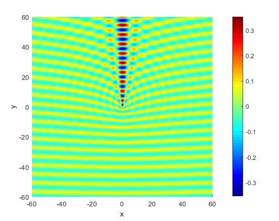 Fig. 1:$\psi_{ \boldsymbol{\mathbf{k}} }^{(+)}( \boldsymbol{\mathbf{r}} )$, $Z = -5$, $ \boldsymbol{\mathbf{k}} = \boldsymbol{\mathbf{y}} $, $\eta = -5$. When $y \to -\infty$ is close to a plane wave. From the perspective of classical mechanics, the closer the particle is to the nucleus, the more the incident deflection. Note that the plane waves on the left and right sides will intersect and interfere after being deflected.