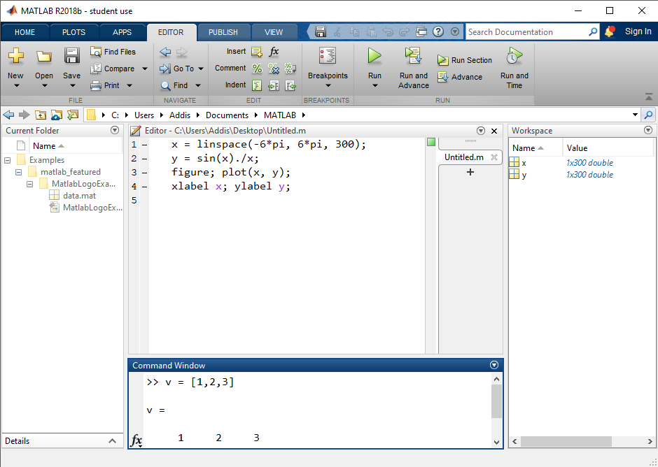 Command Window 主要用于输入临时指令或者调试程序,可输入除了函数定义外的任意指令.Command Window 只能按输入顺序执行,不方便修改和编辑,如果指令较长或有多个指令,应该使用 Editor.在 Command Window 中按回车执行输入的指令,按上箭头可重复已输入的指令.