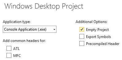 在 Wizard 中取消预编译(Precompiled Header)选项, 选择空项目(Empty Project)按确定生成控制台程序(Console Application).