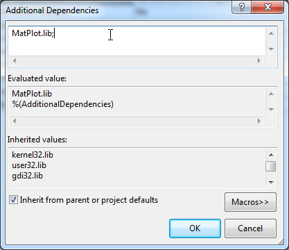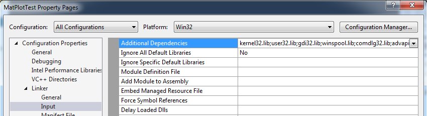 在属性对话框中的 Linker,Input,Additional Dependencies 的右边按下拉按钮