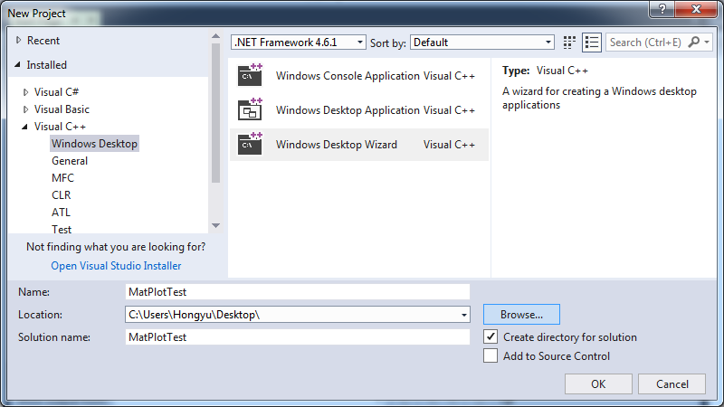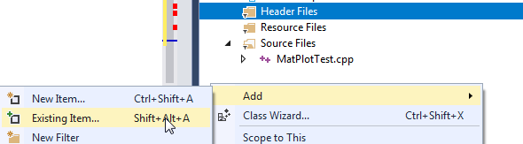 选择刚才复制的 MatPlot.h 头文件.我们再在 “源文件” 文件夹中添加一个新项目,在弹出的对话框中选择 .cpp,输入文件名为 MatPlotTest.cpp