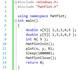 现在就可以在 cpp 文件中输入上文的例程代码并编译运行了.注意使用 MatPlot 的源文件中必须添加 Windows.h 和 MatPlot.h 头文件.