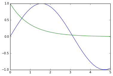 来告诉解释器在浏览器中显示图像.现在我们来看看如何使用这个库.例如在 [0,5] 区间均匀取 30 个点,分别计算 $ \sin\left(x\right) $ 与 $ \exp\left(x\right) $,并作图