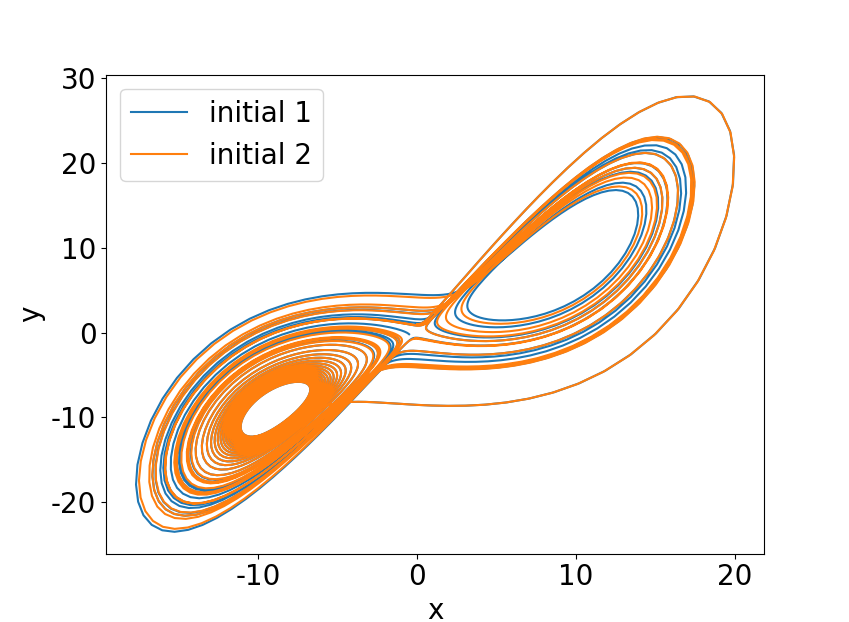 这里我们还使用到了第四个参数 args,它是一个 tuple 类型,给函数传递额外的参数.我们看到即使初始值只相差 0.01,两条运动轨迹也是完全不同的.