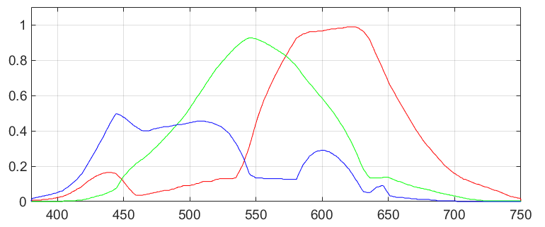 当电脑储存一张彩色图片时,每个像素会被储存为 red, green, blue(或记为 RGB)三个数,每个数一般取 $0$ 到 $255$ 的整数,有时候也取 $0$ 到 $1$ 的实数.fig. 1 中,RGB 三个分量的大小如fig. 2 所示,这可以反映出人眼中三种受体对不同波长的敏感程度.