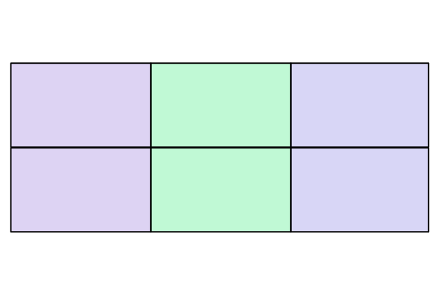 Fig. 1:子群和陪集的示意图.整张图表示 $\mathbb{Z}$ 本身;中间的两个绿色区域表示 $3\mathbb{Z}$,左边的两个紫色区域表示 $1+3\mathbb{Z}$ 而右边的两个紫色区域表示 $2+3\mathbb{Z}$;中间上面的绿色区域表示 $6\mathbb{Z}$,而下面的绿色区域表示 $3+6\mathbb{Z}$,剩下的四个紫色区域分别表示 $6\mathbb{Z}$ 的另外四个左陪集.