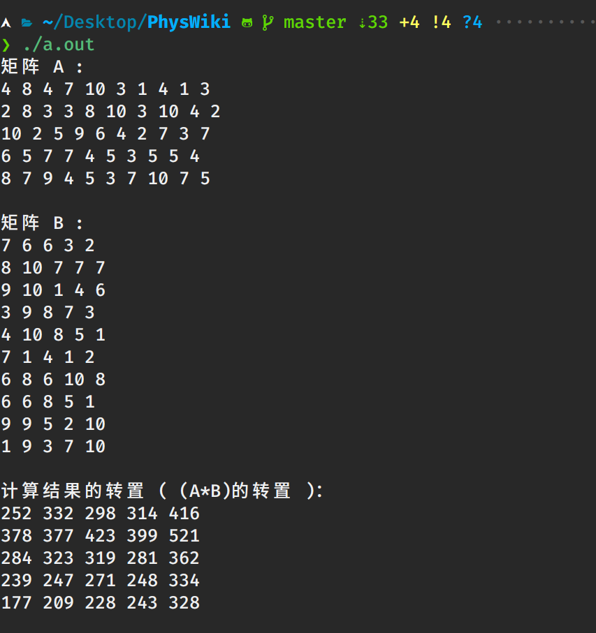 cout << "计算结果的转置 ( (A*B)的转置 ):" << endl;
