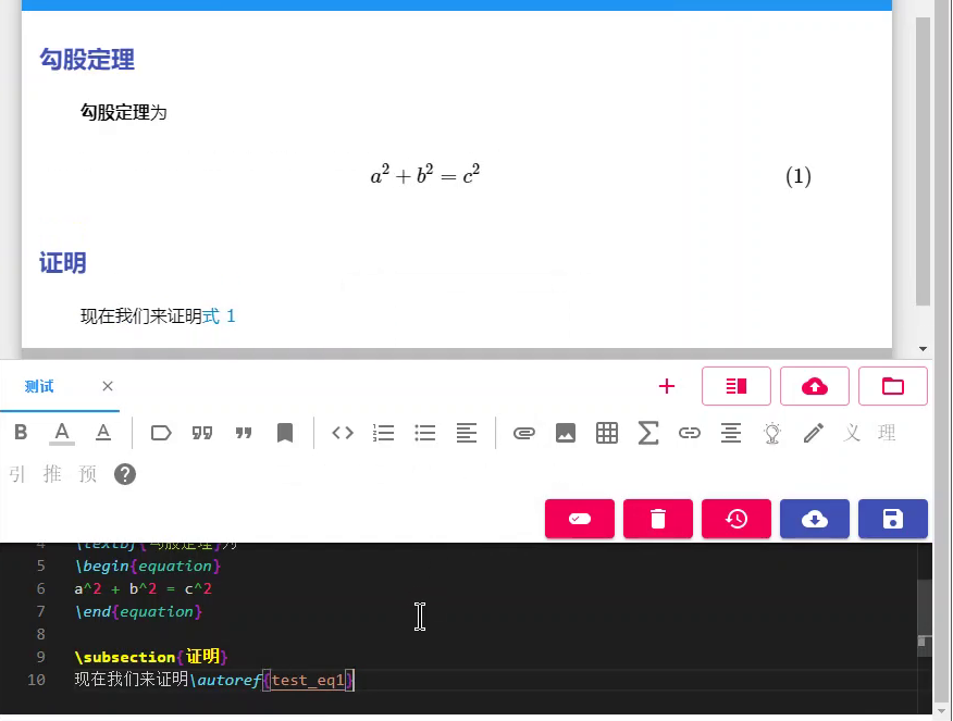 我们必须强调这个编辑器只是在 MathJax1 的基础上做了一个非常简单的拓展,所以如果你直接把自己的 LaTeX 代码复制进来多半会遇到严重的问题.我们在 MathJax 的基础上另外实现了一些基本命令如 \subsection{},\textbf{},常用环境的简单格式以及对他们的引用.这些功能绝大部分可以在工具栏上找到.最后,编辑器只支持百科的模板,整个百科是一个 document 环境,主文件是 main.tex,其他所有 tex 文件都将作为一个 section 插入 main.tex 中,不需要手动添加 \section{} 命令.