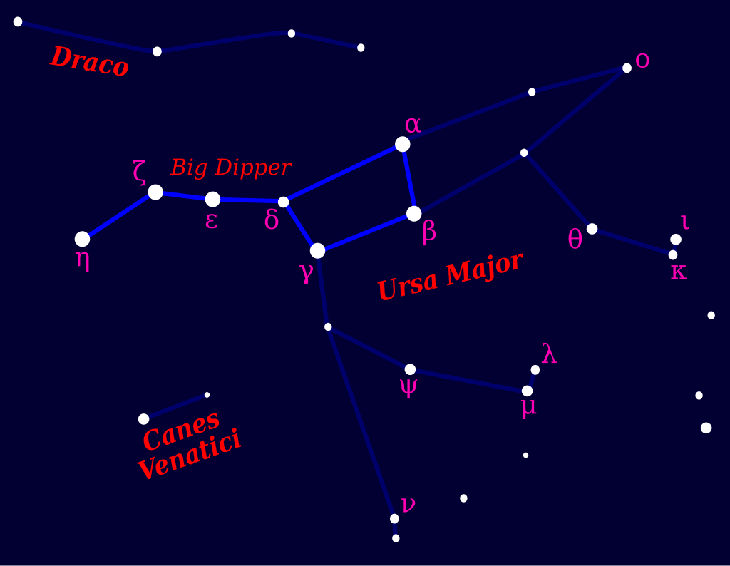- 北斗七星(The Big Dipper),又称 “犁”(The Plough)或 “查理之车”(Charles’s Wain),由大熊座中最亮的七颗恒星组成。这些恒星勾勒出熊的后半身与被夸张延伸的尾巴,或可视为构成熊头与颈部上轮廓的 “柄”。相比之下,小熊座因其尾部更长而几乎不似熊形,因此更广为人知的名称是 “小北斗”(The Little Dipper)。