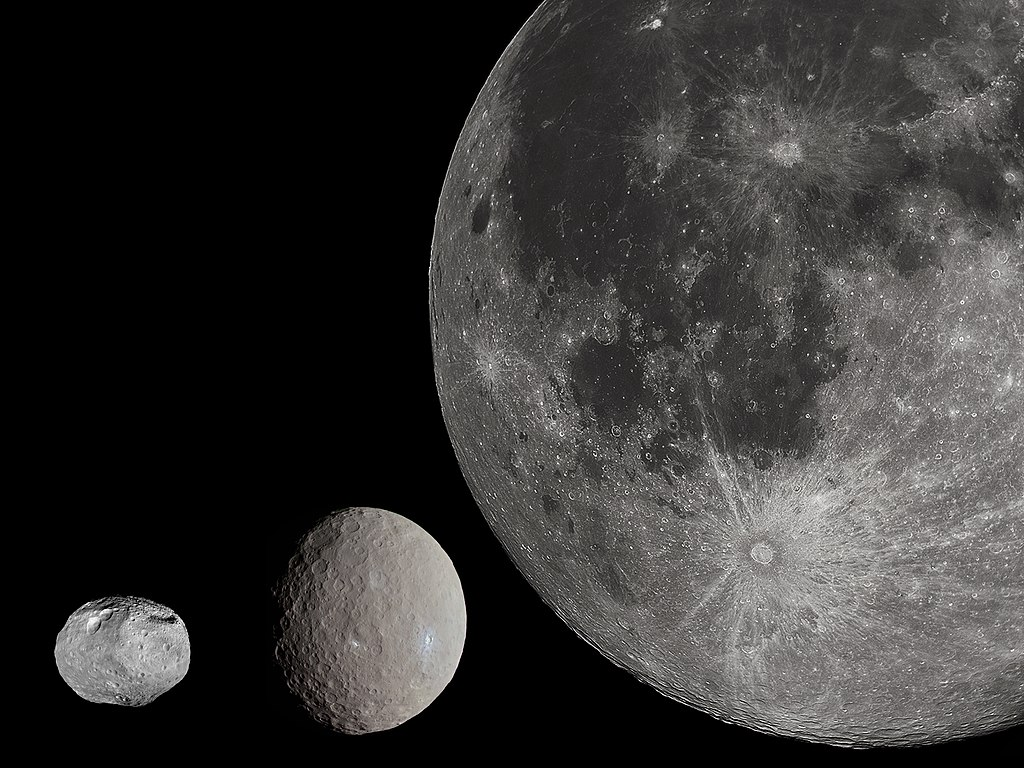 图 3:按相同比例展示的 Vesta(左)、Ceres(中)与月球(右)