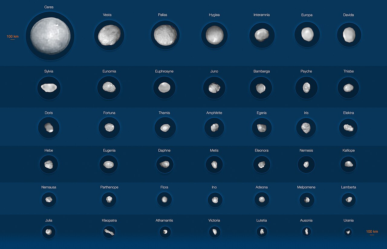 图 11:由欧洲南方天文台超大望远镜(VLT)拍摄的、小行星带内 42 个最大天体影像