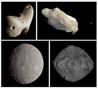 图 1:被探测访问过的小行星影像展示其差异:(上排)433 Eros 与 243 Ida 及其卫星 Dactyl,(下排)Ceres 与 101955 Bennu。尺寸不按比例绘制。