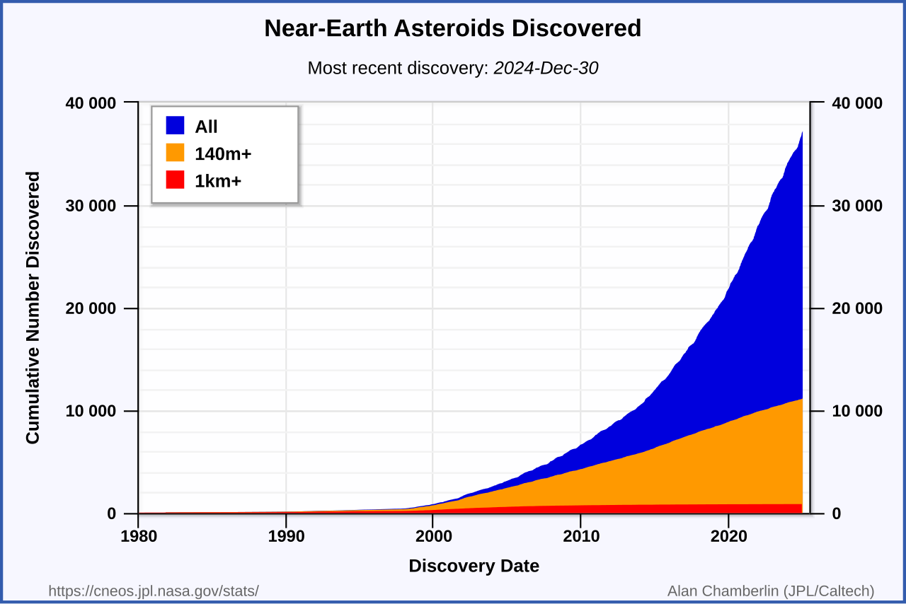 尽管小行星数量极为庞大,但其发现在人类天文学史上相对较晚,第一颗小行星——Ceres——直到 1801 年才被识别出来 \(^\text{[21]}\)。在暗夜且观测条件良好的情况下,只有一颗小行星,即表面反照率较高的 4 Vesta,通常能够以肉眼看见。极少数情况下,当小型小行星非常接近地球时,也可能在短暂时间内被肉眼观测到 \(^\text{[22]}\)。截至 2025 年 5 月,小行星中心(Minor Planet Center)已记录太阳系内外共计 1,460,356 颗小行星的数据,其中约有 826,864 颗具备足够观测信息而获得编号编号 \(^\text{[23]}\)。