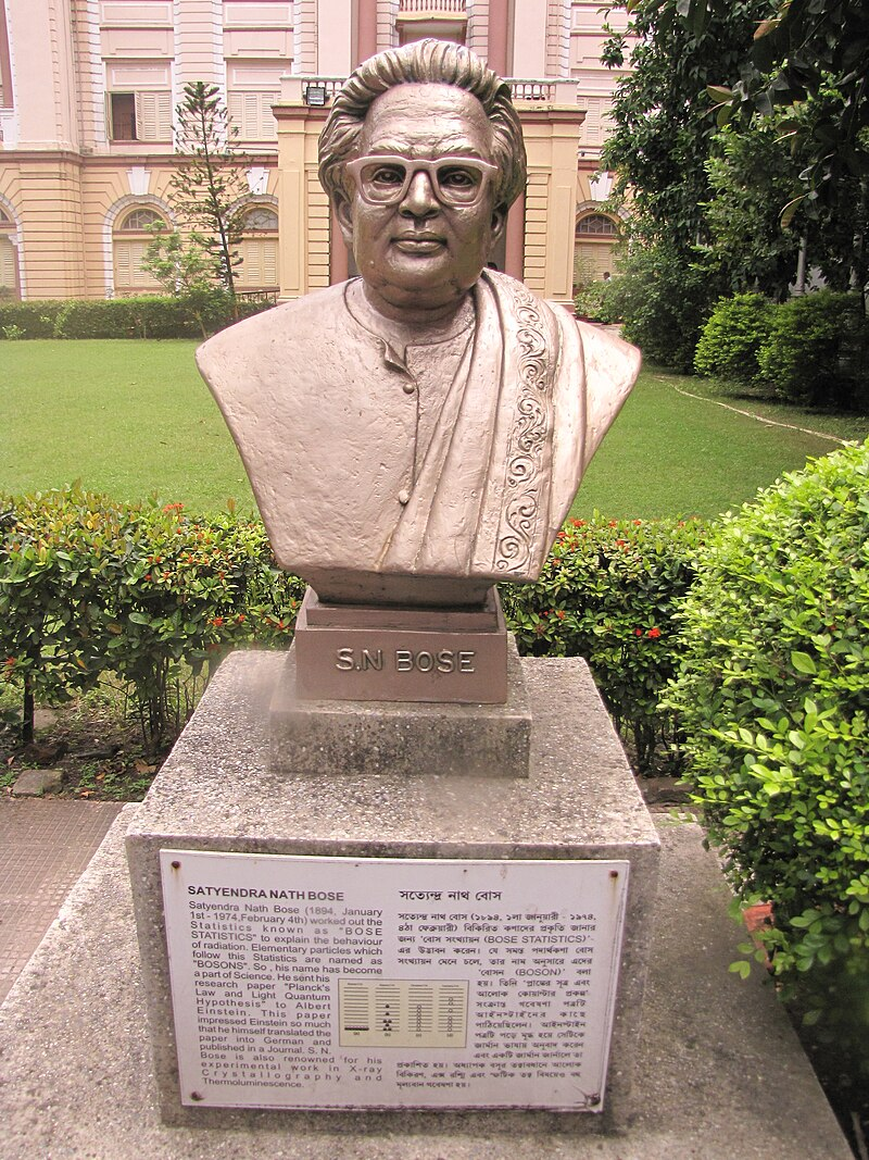 萨特延德拉·纳特·玻色(Satyendra Nath Bose,FRS,印度国会议员)\(^\text{[1]}\)(/ˈboʊs/;\(^\text{[4]}[a]\)1894 年 1 月 1 日-1974 年 2 月 4 日)是印度理论物理学家和数学家。他最著名的成就是在 20 世纪 20 年代初对量子力学的研究,奠定了玻色–爱因斯坦统计的基础,并发展出玻色–爱因斯坦凝聚态理论。他是英国皇家学会院士,并于 1954 年获得印度政府颁发的印度第二高平民荣誉——帕德玛·毗布尚奖。\(^\text{[5][6][7]}\)