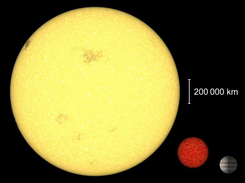 图 8:太阳、一个年轻的次褐矮星与木星的体积大小对比。随着次褐矮星逐渐老化,它会不断冷却并收缩。