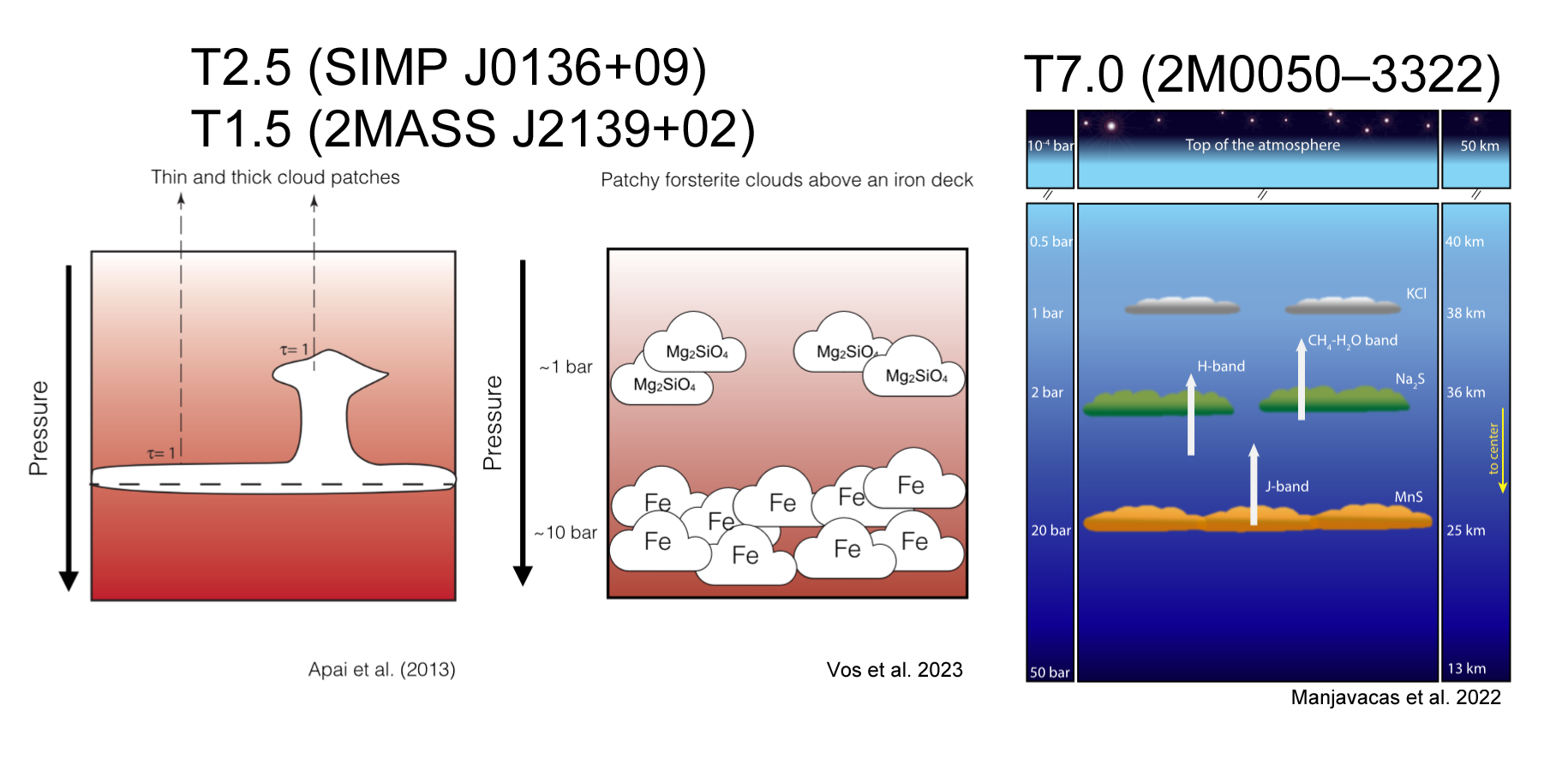 图 6:早期 T 型褐矮星 SIMP J0136+09 和 2MASS J2139+02(左侧两个面板)的云模型,以及晚期 T 型褐矮星 2M0050–3322 的云模型。