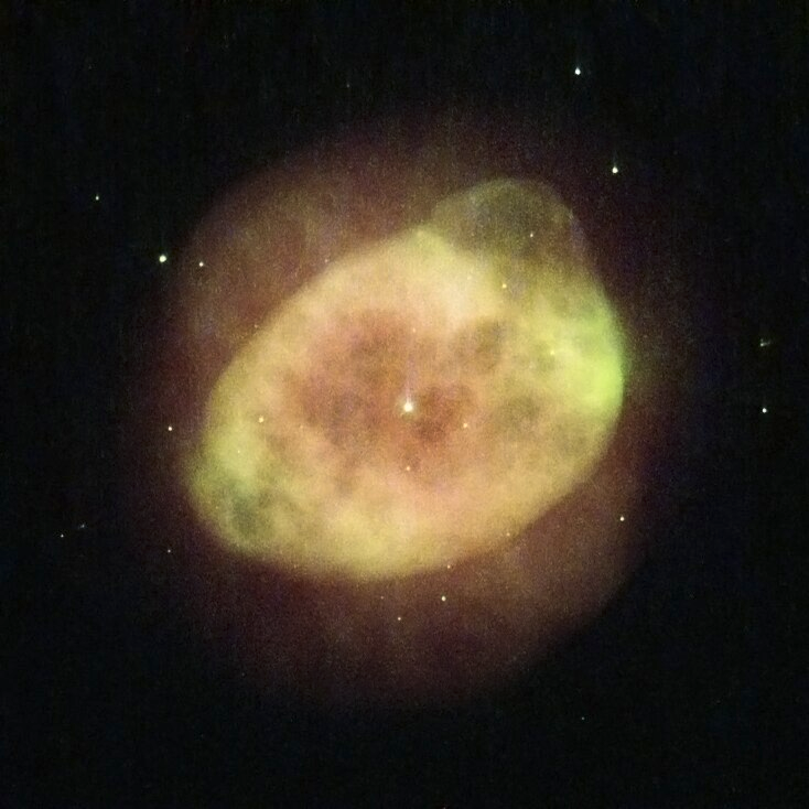 NGC~457 是仙后座中的另一处疏散星团,也被称为 E.T. 星团、猫头鹰星团以及 Caldwell~13。该星团于 1787 年由威廉·赫歇尔发现。其总星等为 6.4,距离地球约 $10{,}000$ 光年,位于银河系的英仙臂之中。然而,其最显著的成员——双星 $\phi$~Cassiopeiae——要近得多,距离仅约 $1{,}000$ 至 $4{,}000$ 光年。NGC~457 较为富集,属于 Shapley~e 级、Trumpler~I~3~r 型星团,其中心较为集中,并与周围恒星场分离。该星团包含超过 100 颗恒星,其亮度差异很大。$^{[42]}$