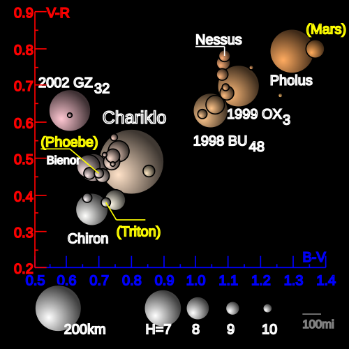 半人马天体的颜色具有高度多样性,这对任何关于其表面成分的简单模型都构成了挑战。$^{[28]}$ 在旁图中,颜色指数是通过蓝光(B)、可见光(V)(即绿—黄色)和红光(R)滤光片测得的视星等差值。该图以夸张的颜色展示了所有已知颜色指数的半人马天体之间的差异。作为参照,还绘制了两颗卫星——海卫一(Triton)和菲比(Phoebe),以及行星火星(黄色标注,尺寸未按比例)。