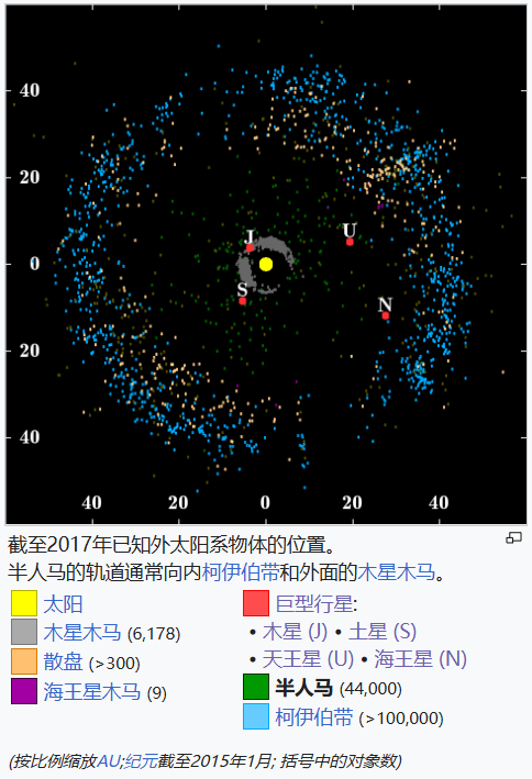 - 为了这个图的目的,一个对象被归类为半人马,如果它的半长轴位于木星和海王星之间