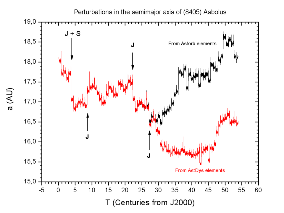 图 3:在未来 5500 年内,Asbolus 的半长轴变化情况,采用了两组略有不同的当前轨道要素估计进行计算。在公元 4713 年与木星发生近距离遭遇之后,这两种计算结果开始出现分歧。$^{[26]}$