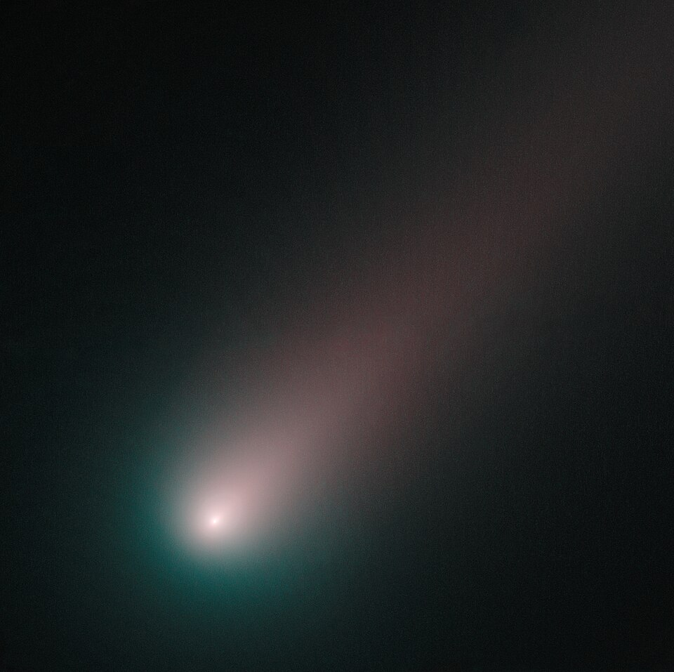 由此释放出的尘埃和气体会在彗星周围形成一个巨大而极其稀薄的大气层,称为 “彗发”(coma)。太阳的辐射压与太阳风施加在彗发上的力会形成一条巨大的彗尾,且彗尾始终指向远离太阳的方向 \(^\text{[51]}\)。
