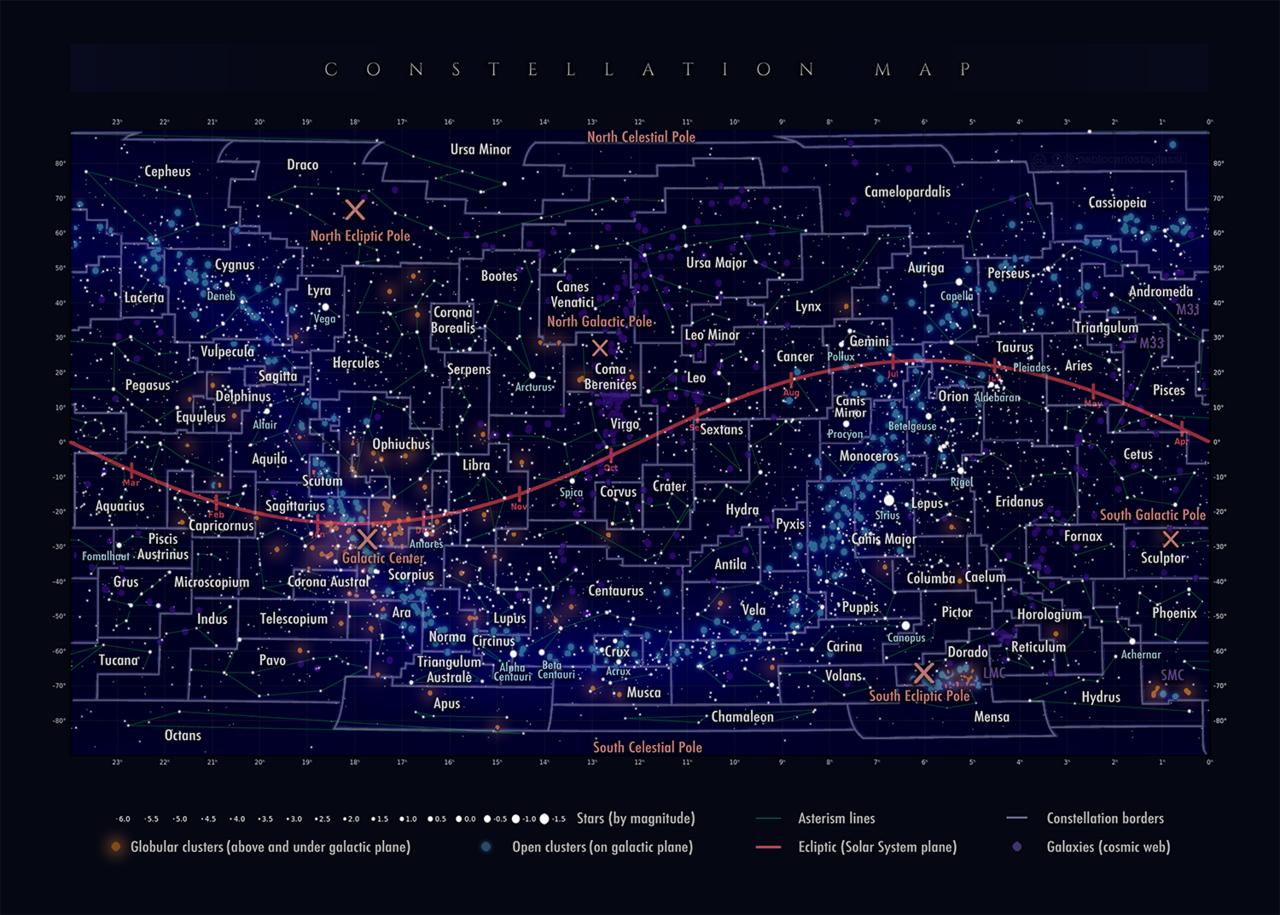 图 2:显示星座、银河以及黄道的星图