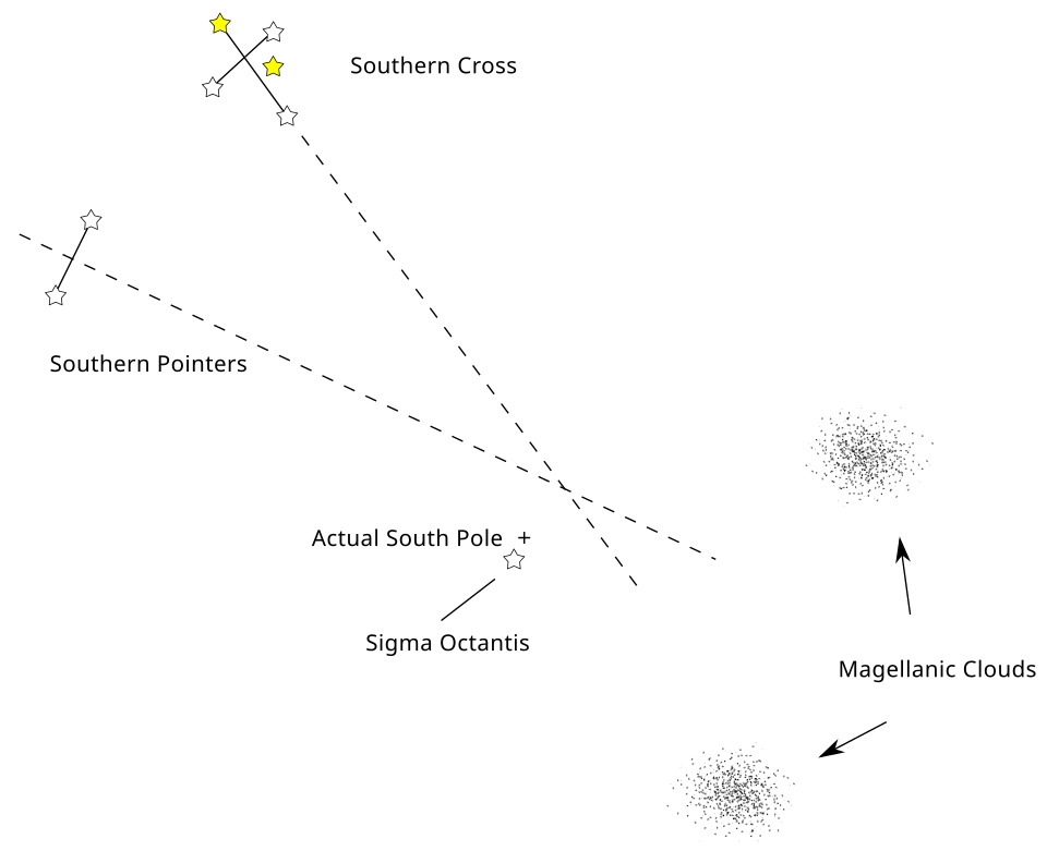 南极座σ星是最接近南天极的恒星,但在夜空中十分暗弱。因此,可以利用南十字座以及半人马座中的α星和β星(相对于南十字座约逆时针 30°)来进行三角定位以确定南天极的位置。$^{[22]}$