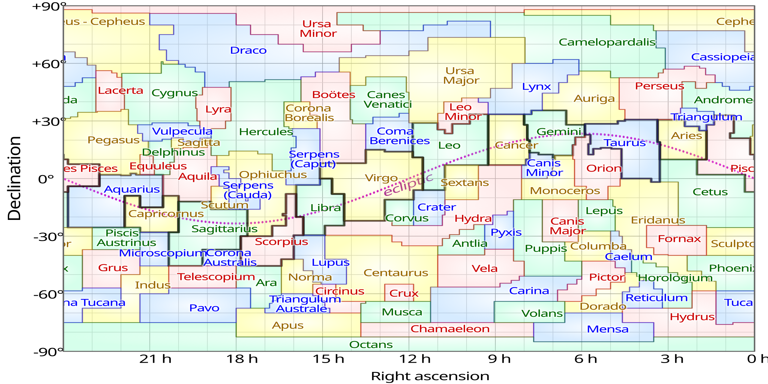 图 9:88 个国际天文学联合会指定星座的等距圆柱投影图,其中黄道星座以轮廓标出