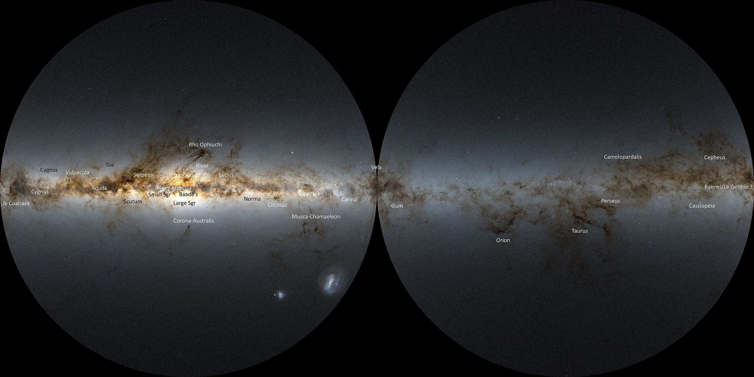 图 10:从地球观测到的银河系,其中显著的暗云结构以白色标注,显著的恒星云以黑色标注。图像下方偏左的位置可见大麦哲伦云和小麦哲伦云。呈星状的天体为银河系的球状星团。
