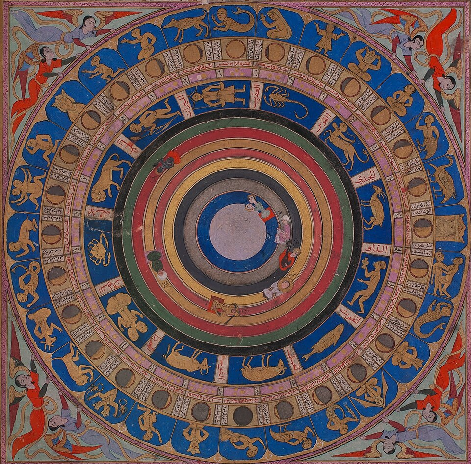 图 13:奥斯曼时期的宇宙志地图,描绘了行星天球、黄道十二宫以及月宿(《Zubdat al-Tawarikh》)