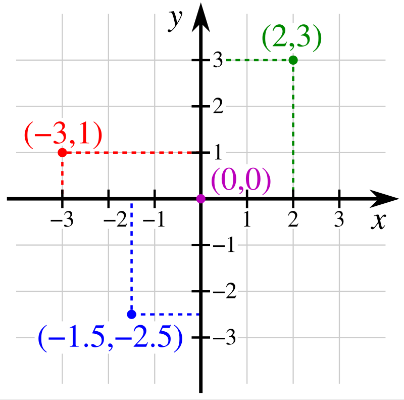 历史上最著名的例子是解析几何中的笛卡尔平面。为了以数值方式表示几何图形,并从图形的数值表示中提取数据信息,勒内·笛卡尔将平面上的每个点对应一个实数对,称为该点的坐标。通常,这对数中的第一个分量和第二个分量分别称为该点的 \(x\) 坐标和 \(y\) 坐标(见图示)。