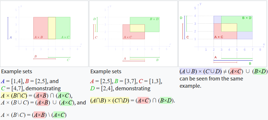 笛卡尔积在交集方面满足如下性质(见中间图): \[ (A \cap B) \times (C \cap D) = (A \times C) \cap (B \times D)~ \] 但在大多数情况下,若将交集替换为并集,上述等式则**不成立**(见最右侧图): \[ (A \cup B) \times (C \cup D) \ne (A \times C) \cup (B \times D)~ \] 实际上,有如下恒等式成立: \[ (A \times C) \cup (B \times D) = [(A \setminus B) \times C] \cup [(A \cap B) \times (C \cup D)] \cup [(B \setminus A) \times D]~ \] 对于差集,还有以下恒等式: \[ (A \times C) \setminus (B \times D) = [A \times (C \setminus D)] \cup [(A \setminus B) \times C]~ \] 以下是展示笛卡尔积与其他运算符分配律的一些规则(见最左侧图)\(^\text{[8]}\): \[ \begin{aligned} A \times (B \cap C) &= (A \times B) \cap (A \times C), \\ A \times (B \cup C) &= (A \times B) \cup (A \times C), \\ A \times (B \setminus C) &= (A \times B) \setminus (A \times C), \end{aligned}~ \] 补集方面,有如下等式: \[ (A \times B)^{\complement} = (A^{\complement} \times B^{\complement}) \cup (A^{\complement} \times B) \cup (A \times B^{\complement}),~ \] 其中 \( A^{\complement} \) 表示集合 \( A \) 的绝对补集。