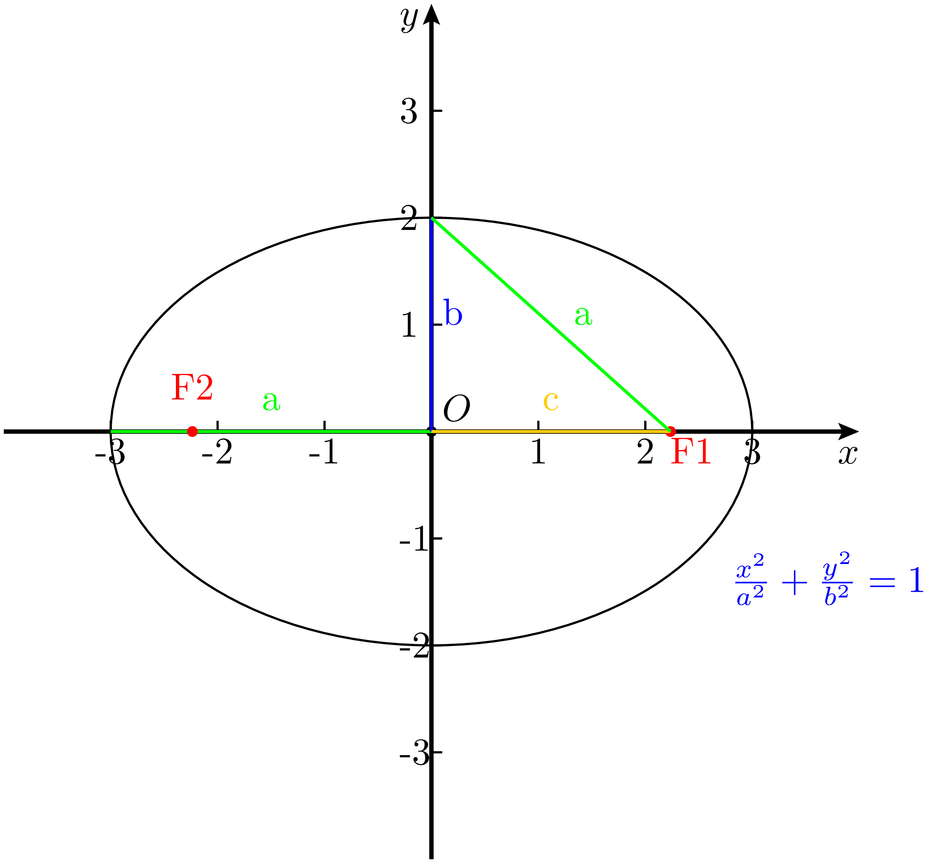 式 14 是椭圆非常重要的一个基本性质,$a,b,c$ 三者的关系正好可以构成一个直角三角形。而恰巧,在椭圆内半焦距与半短轴永远是垂直的,因此将半短轴的端点与焦点连起来构成的直角三角形的斜边长恰好就是半长轴。