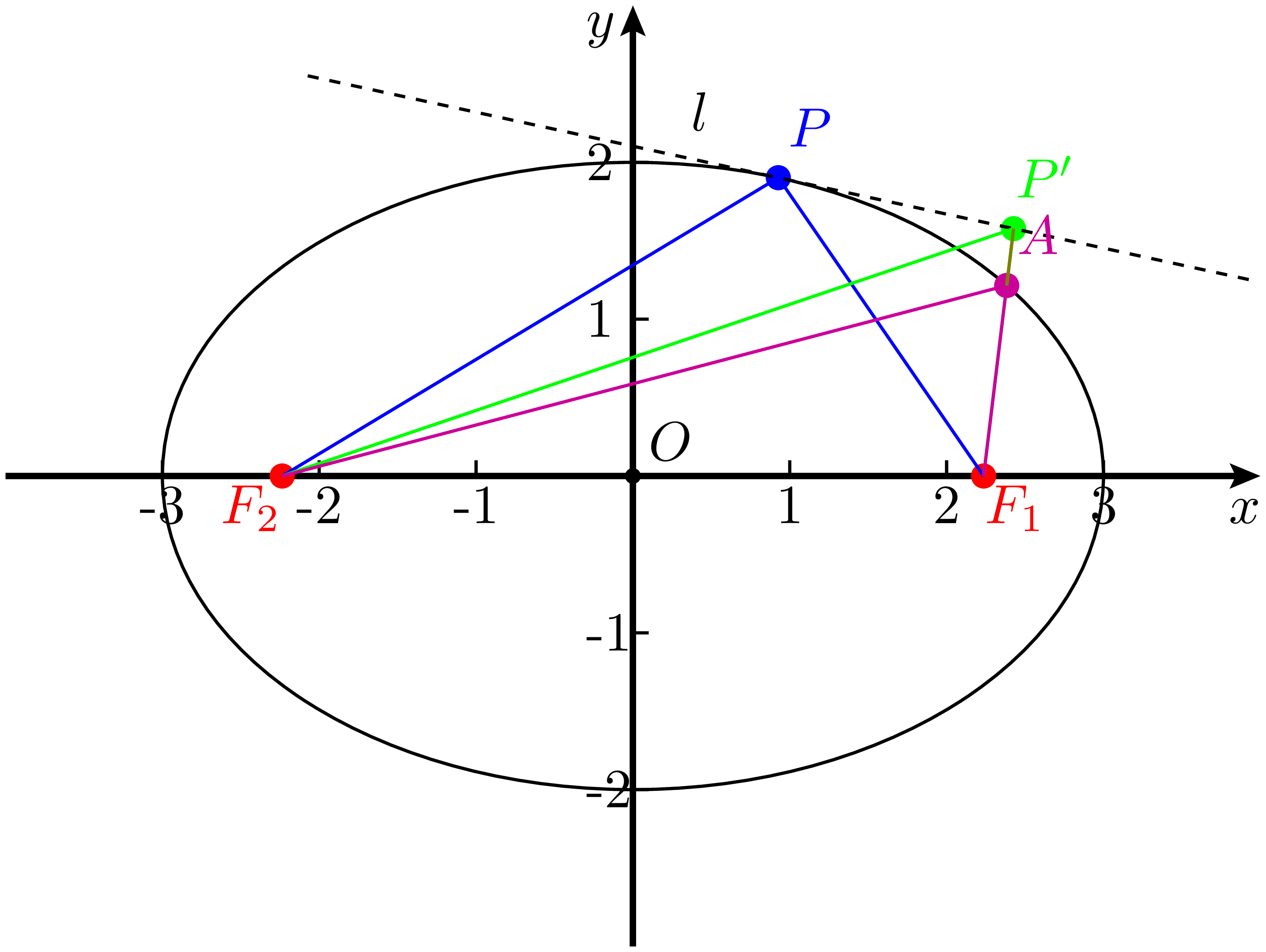 这个性质的证明也不难,如图 5 对于椭圆上任意一点 $P$,在 $P$ 处的切线 $l$ 上任取 $P$ 外一点 $P'$。则对于椭圆的两个焦点 $F_1,F_2$,连接 $PF_1,PF_2,P'F_1,P'F_2$,则由于 $l$ 是切线,$P'F_1$ 必与椭圆相交于一点,记作 $A$,连接 $AF_2$,则在三角形 $P'AF_2$ 中,根据三角形不等式有 $|AF_2|<|AP'|+|P'F_2|$,从而有: