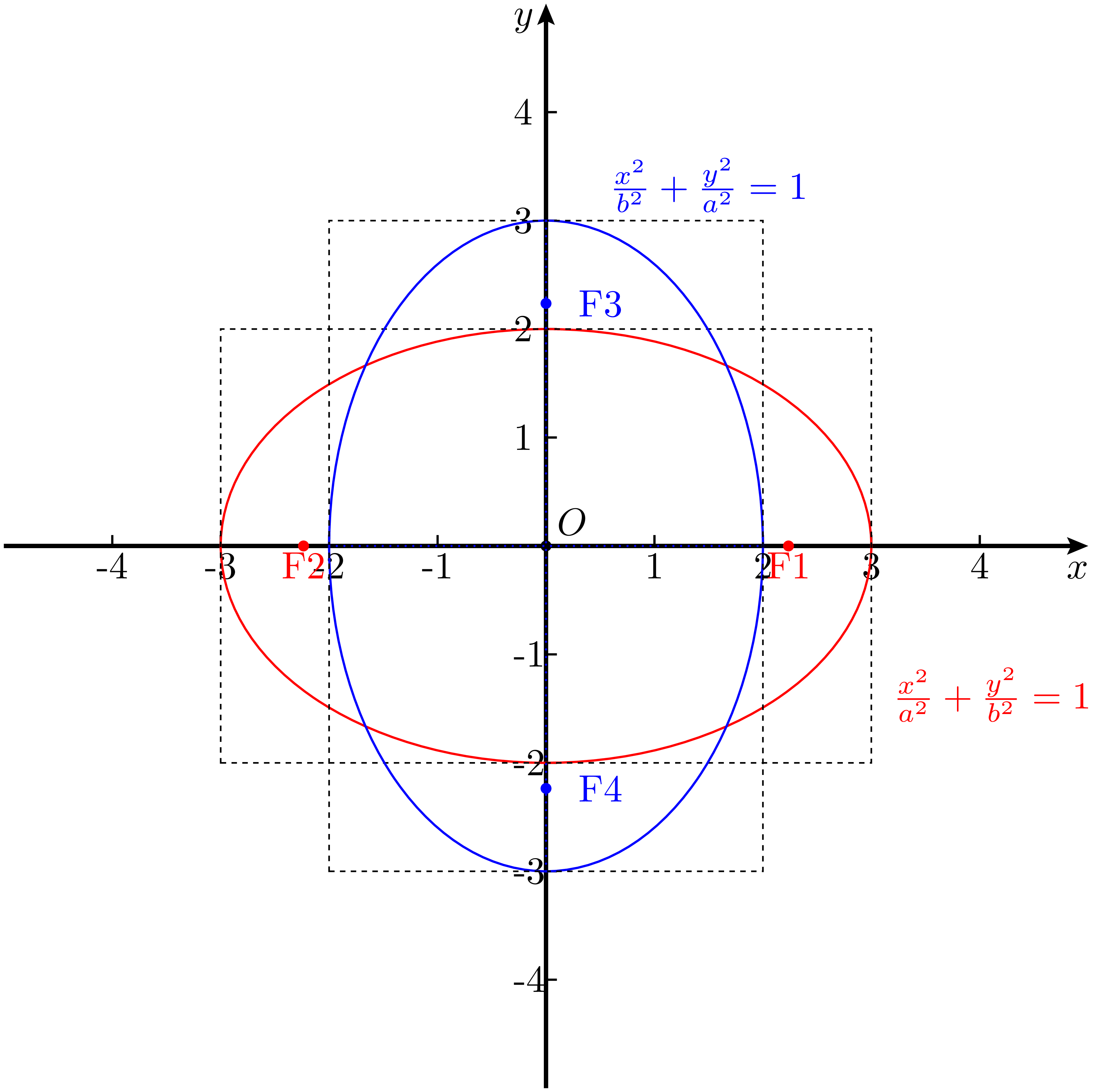 由于 $m>2c>0$,也就是 $\displaystyle\left(\frac{m}{2}\right)^2-c^2>0$,可以看出,例 1 的结果的形式与式 2 相同,也就是说二者的结果对应着同一个形状,就称其为椭圆(ellipse)。同理易知,如果两个定点分别为 $F_1(0,-c)$ 和 $F_2(0,c),(c>0)$,则相当于更换 $x,y$ 的结果位置,得到的表达式是: