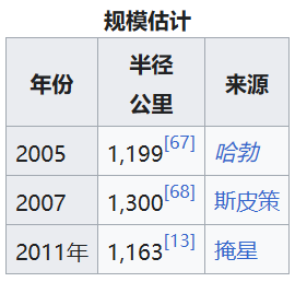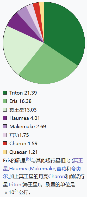 2015 年 7 月,在 Eris 几乎被认为是太阳系中第九大直接绕 Sun 运行的已知天体近十年后,New Horizons 任务的近距离成像确定 Pluto 的体积略大于 Eris\(^{[73]}\)。因此,就体积而言,Eris 是已知直接绕 Sun 运行的天体中第十大者,而就质量而言则为第九大者 \(^{[citation needed]}\)。