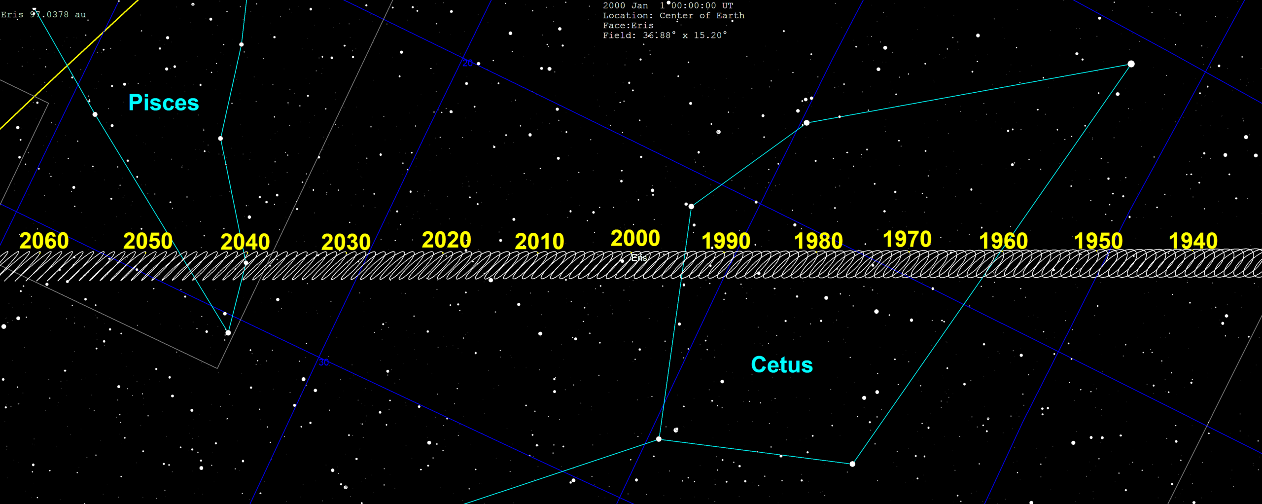 由于其轨道倾角很大,Eris 仅穿过传统黄道带的少数几个星座;目前它位于 Cetus 星座。它从 1876 年到 1929 年位于 Sculptor 星座,从约 1840 年到 1875 年位于 Phoenix 星座。它将在 2036 年进入 Pisces,并停留到 2065 年,届时将进入 Aries\(^{[66]}\)。随后它将移入北天,在 2128 年进入 Perseus,并在 2173 年进入 Camelopardalis(在此处达到其最北赤纬)。