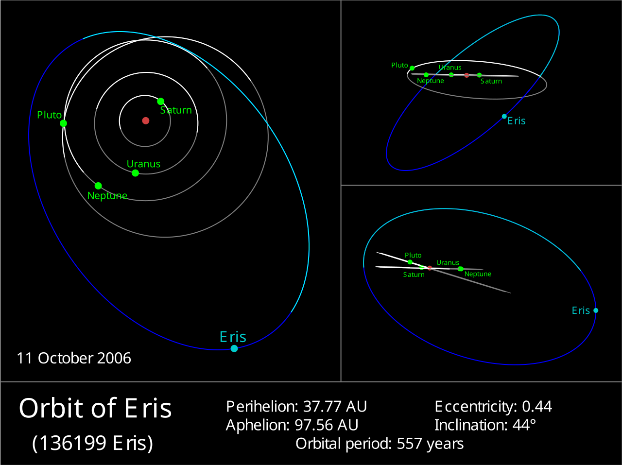 Eris 已知有一颗大型卫星,名为 Dysnomia。2016 年 2 月,Eris 与太阳的距离为 96.3 AU(144.1 亿 km;89.5 亿 mi)\(^{[21]}\),超过 Neptune 或 Pluto 距离的三倍。除长周期彗星外,直到 2018 年发现 2018 AG37 和 2018 VG18 之前,Eris 与 Dysnomia 一直是太阳系中已知距离最遥远的天然天体 \(^{[21]}\)。