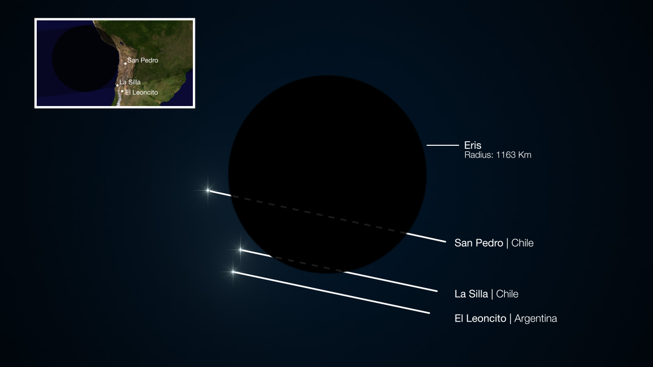 2010 年 11 月,Eris 成为迄今为止从 Earth 观测到的最遥远恒星掩食事件之一 \(^{[14]}\)。该事件的初步数据对此前的大小估计提出质疑 \(^{[14]}\)。研究团队于 2011 年 10 月公布掩食结果,估计其直径为 2326±12 km\(^{[13]}\)。
