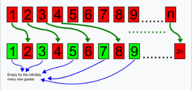 同样也可以容纳可数无限多的新客人:只需将占用 1 号房间的人移到 2 号房间,将占用 2 号房间的人移到 4 号房间,通常,将占用 n 号房间的人移到 2n 号房间(n 的两倍),这样所有奇数编号的房间(它们是可数无限的)就会空出来,供新客人使用。