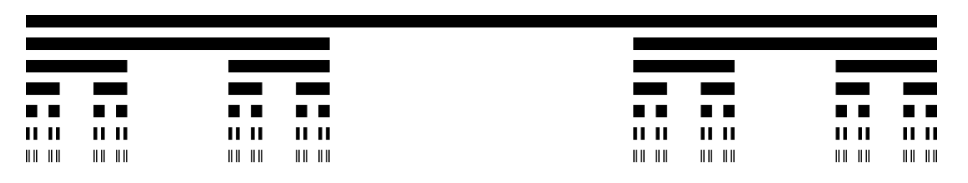 凝结:康托尔棒的构造源自我称之为 “凝结” 的过程。它从一根圆柱棒开始,最好将其想象为密度极低的材料。然后,棒的物质从中间三分之一 “凝结” 到两端的三分之一部分中,使得两端部分的位置保持不变。接着,每个端三分之一的中间三分之一部分的物质再次凝结到其各自的两端三分之一部分中,如此反复无穷,直到最终剩下无限多个、无限细而密度无限高的小块。这些小块沿直线以一种由生成过程精确决定的方式分布。在这个图示中,“凝结” 最终甚至需要 “锤打” 才能继续,但当印刷机和我们的肉眼都无法再分辨时,过程便终止了:最后一行与倒数第二行已无法区分——它的每一个最终部分都被看作是一个灰色的小块,而非两个并列的黑色小块。\(^\text{[9]}\)