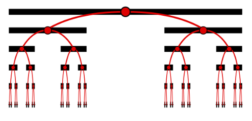 康托尔集是分形的原型。它是自相似的,因为它等于两个自身的拷贝,这两个拷贝分别缩小了 1/3 倍并进行了平移。更确切地说,康托尔集等于它的两个自相似变换——左变换和右变换——的并集,其中:左变换为 $T_L(x) = x/3$,右变换为 $T_R(x) = (2 + x)/3$。这两个变换在同胚意义下保持康托尔集的不变性,即: $$ T_L(\mathcal{C}) \cong T_R(\mathcal{C}) \cong \mathcal{C} = T_L(\mathcal{C}) \cup T_R(\mathcal{C})~ $$ 对 $T_L$ 和 $T_R$ 反复迭代可以形象地表示为一棵无限二叉树。在这棵树的每个节点上,可以选择左子树或右子树。将变换集 $\{T_L, T_R\}$ 与函数复合操作一起考虑,会形成一个二元幺半群。
