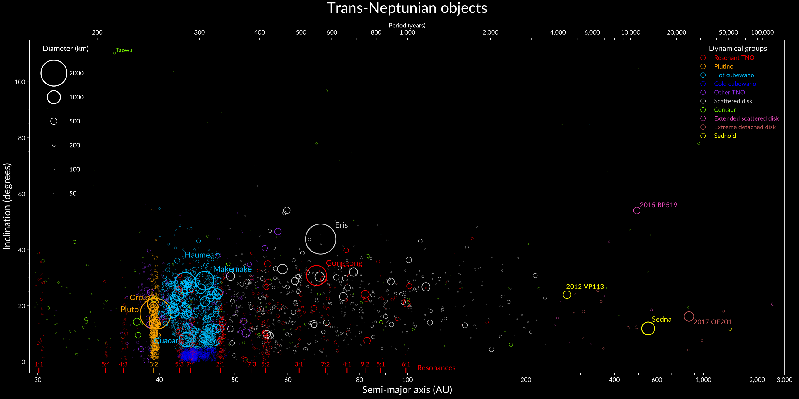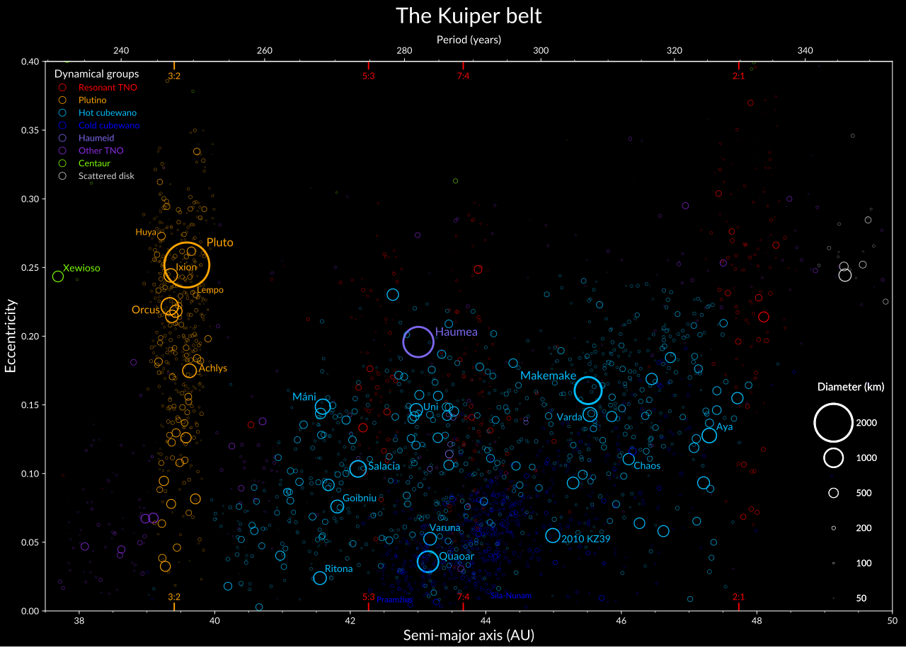 图 6:柯伊伯带的半长轴与偏心率结构示意图。冥族天体(plutinos)以橙色表示,其他处于共振状态的天体以红色表示。非共振的“热”经典柯伊伯带天体(hot cubewanos)以天蓝色表示,而“冷”经典柯伊伯带天体(cold cubewanos)以深蓝色表示。妊神星(Haumea)碰撞家族以蓝灰色表示。图中标注了若干重要天体。