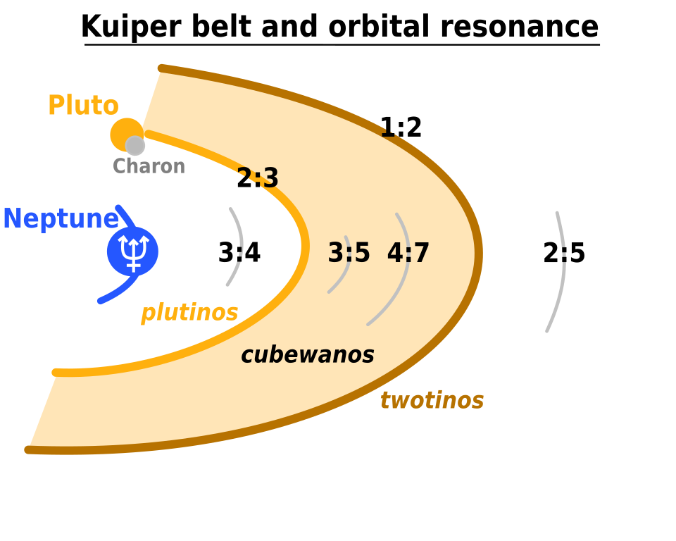 当一个天体的轨道周期与海王星的轨道周期呈精确整数比时(这种情况称为平均运动共振),如果二者的相对构型合适,该天体就可能与海王星形成同步运动,从而避免被其引力扰动而偏离轨道。举例来说,若某天体每绕太阳运行两周,海王星恰好运行三周,并且该天体在近日点时海王星与其相隔约四分之一个轨道,那么每当天体再次回到近日点时,海王星都会处在与最初几乎相同的相对位置,因为在相同时间内海王星完成了 $1\tfrac{1}{2}$ 圈公转。这种情形被称为 2:3(或 3:2)共振,其对应的特征半长轴约为 39.4 AU。该 2:3 共振区内已知约有 200 个天体 $^{[62]}$,其中包括冥王星及其卫星。基于这一点,这一族群的成员被称为冥族天体(plutinos)。许多冥族天体(包括冥王星)具有与海王星轨道相交的轨道,但由于共振机制的存在,它们实际上不可能与海王星发生碰撞。冥族天体通常具有较高的轨道偏心率,这表明它们并非在当前位置原生形成,而更可能是在海王星向外迁移过程中被随机抛射到现有轨道上的 $^{[63]}$。国际天文学联合会(IAU)的命名规范规定,所有冥族天体都必须像冥王星一样,以冥界神祇命名 $^{[53]}$。