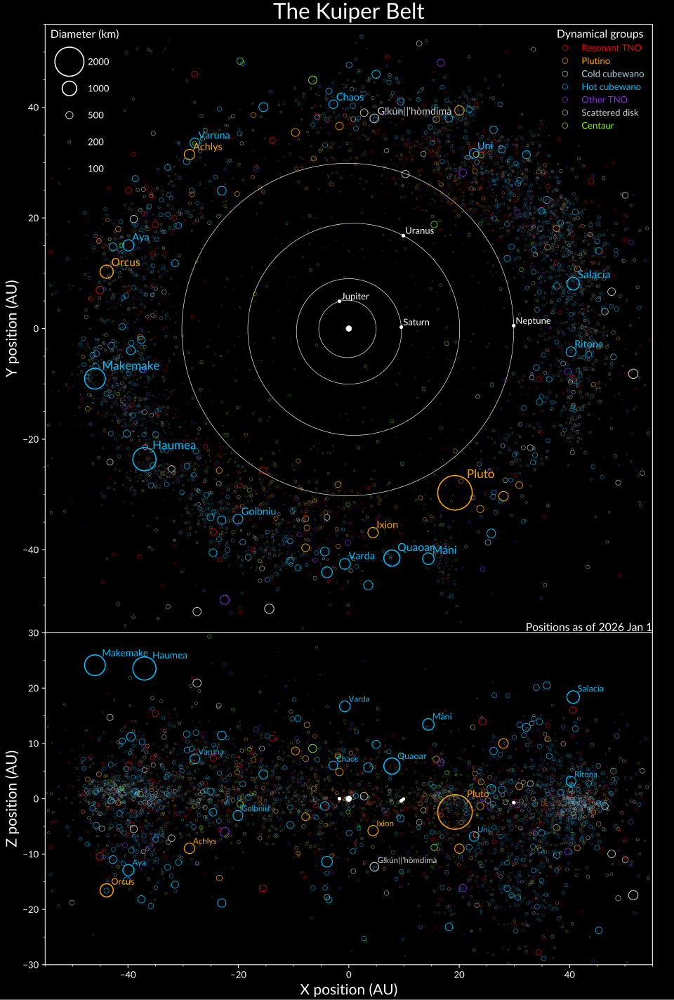 图 16:海王星轨道之外、柯伊伯带中的已知大型天体(比例单位为 AU。距离按比例绘制,大小未按比例。历元截至 2026 年 1 月。$^{[112]}$)。