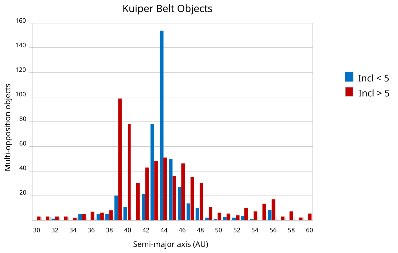 图 9:柯伊伯带天体半长轴的直方图,其中分别展示了轨道倾角高于和低于 5° 的天体分布。在 39–40 AU 和 44 AU 处可以清晰看到由冥族天体(plutinos)以及“核心区(kernel)”产生的峰值。