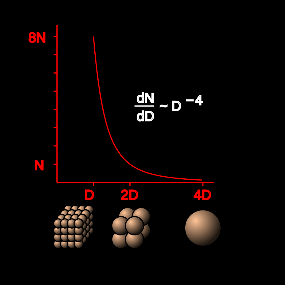 柯伊伯带天体的尺寸分布遵循若干种**幂律关系**。幂律描述的是 $N(D)$(直径大于 $D$ 的天体数量)与 $D$ 之间的关系,通常称为**亮度斜率**。天体数量与直径 $D$ 的某个幂次成反比: