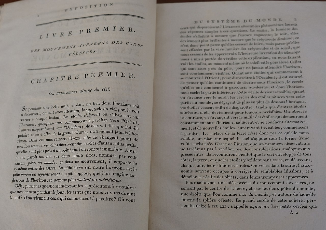前者于 1796 年出版,提供了对现象的一般解释,但省略了所有细节。它包含了天文学历史的概述。这个概述为作者赢得了进入法兰西科学院 40 名成员的荣誉,并被普遍认为是法国语言文学的杰作之一,尽管它在处理后期天文学内容时并不完全可靠。