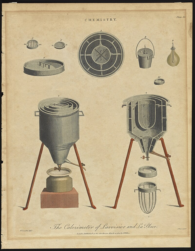 从 1780 年到 1784 年,拉普拉斯与法国化学家安托万·拉瓦锡(Antoine Lavoisier)合作进行了一些实验研究,为这些任务设计了自己的设备。[14] 1783 年,他们共同发表了论文《关于热的回忆录》,在其中讨论了分子运动的动理论。[15] 在他们的实验中,他们测量了不同物体的比热和金属在温度升高时的膨胀情况。他们还测量了乙醇和醚在压力下的沸点。